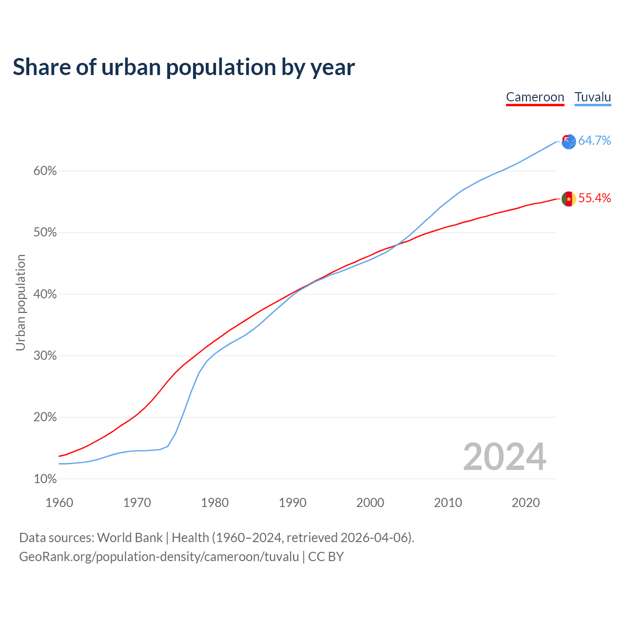 From 2004 to 2024, the share of urban population changed from 48.2% to 55.4% in Cameroon and from 48.4% to 64.7% in Tuvalu.