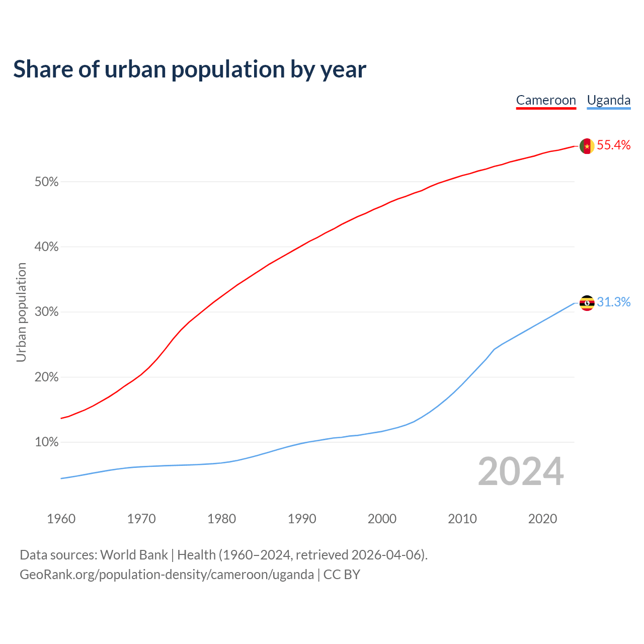 From 2004 to 2024, the share of urban population changed from 48.2% to 55.4% in Cameroon and from 13.1% to 31.3% in Uganda.