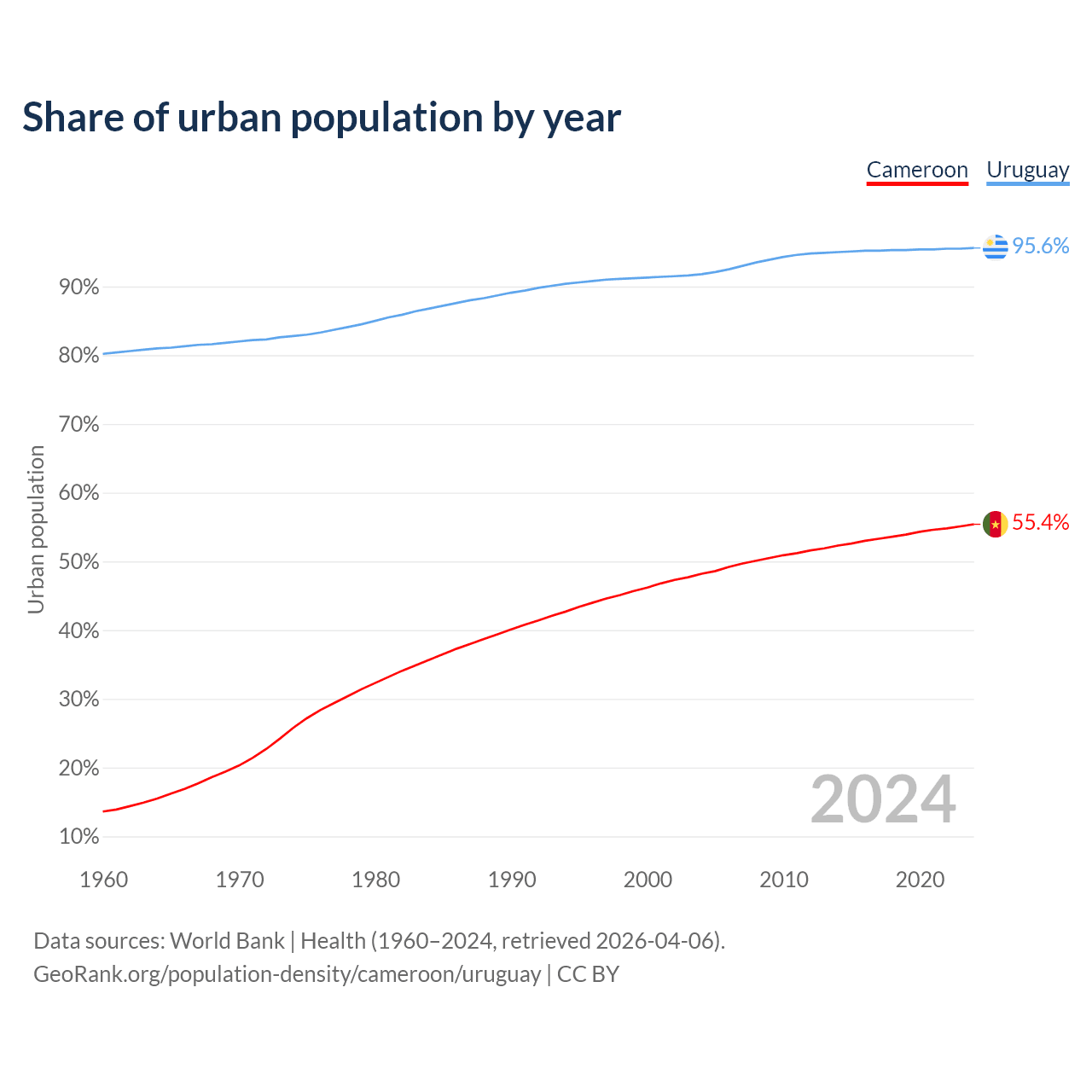 From 2004 to 2024, the share of urban population changed from 48.2% to 55.4% in Cameroon and from 91.8% to 95.6% in Uruguay.