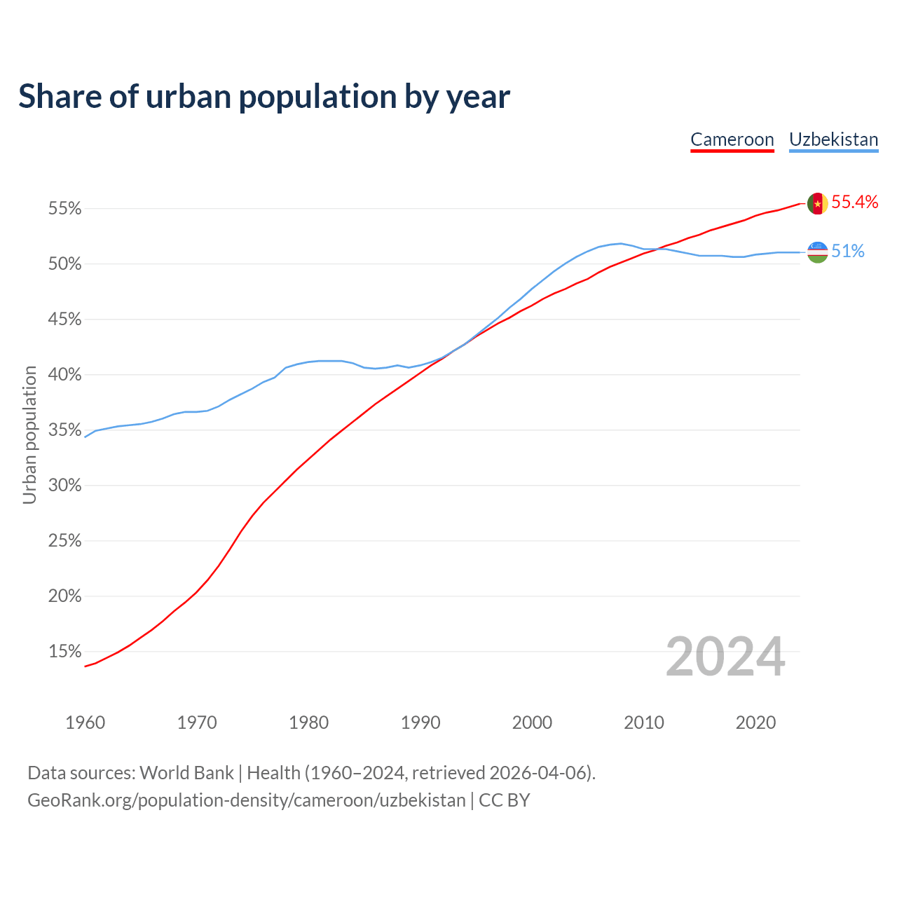 From 2004 to 2024, the share of urban population changed from 48.2% to 55.4% in Cameroon and from 50.6% to 51% in Uzbekistan.