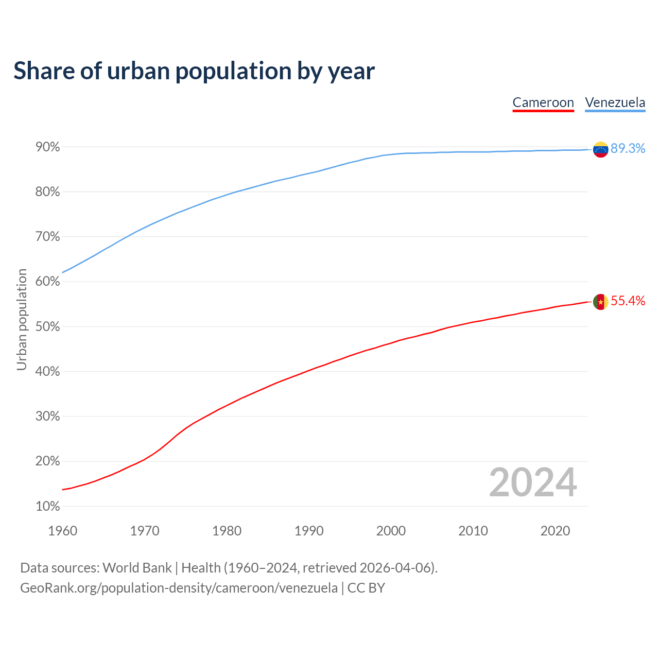 From 2004 to 2024, the share of urban population changed from 48.2% to 55.4% in Cameroon and from 88.6% to 89.3% in Venezuela.