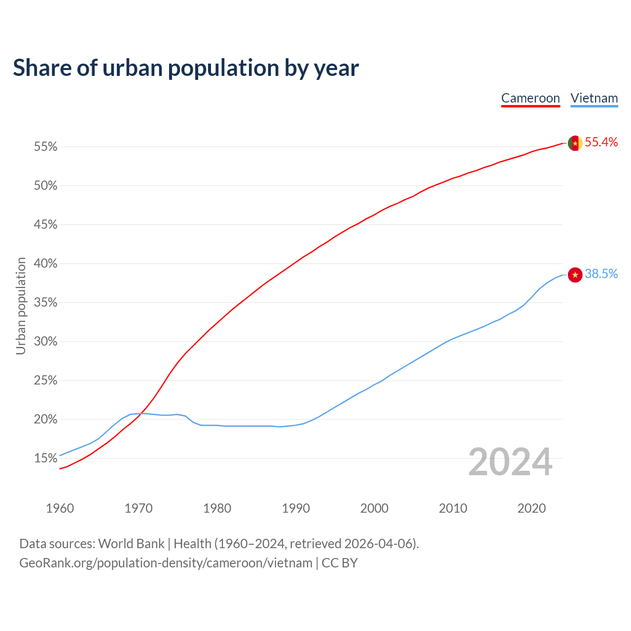 From 2004 to 2024, the share of urban population changed from 48.2% to 55.4% in Cameroon and from 26.8% to 38.5% in Vietnam.