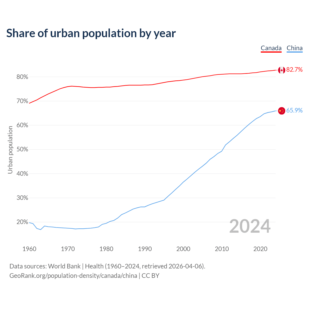 From 2004 to 2024, the share of urban population changed from 79.7% to 82.7% in Canada and from 41.8% to 65.9% in China.