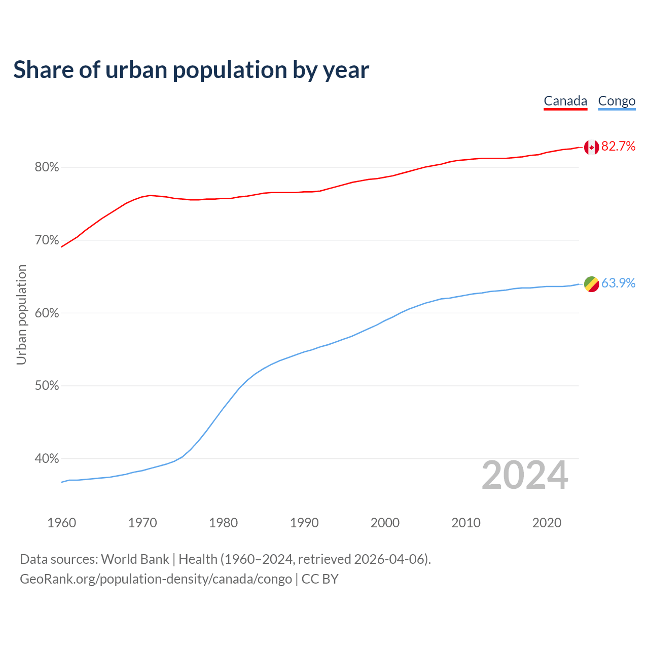 From 2004 to 2024, the share of urban population changed from 79.7% to 82.7% in Canada and from 60.9% to 63.9% in the Congo.