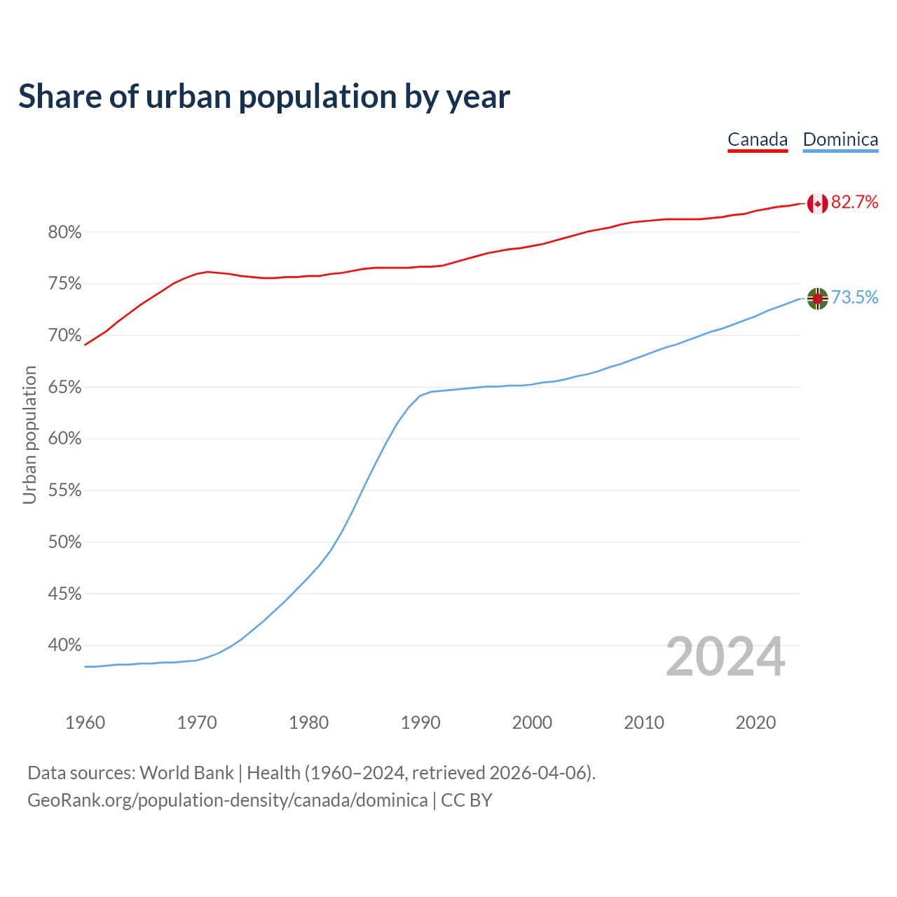 From 2004 to 2024, the share of urban population changed from 79.7% to 82.7% in Canada and from 66% to 73.5% in Dominica.