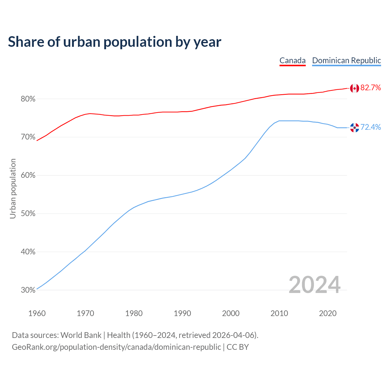 From 2004 to 2024, the share of urban population changed from 79.7% to 82.7% in Canada and from 65.9% to 72.4% in the Dominican Republic.
