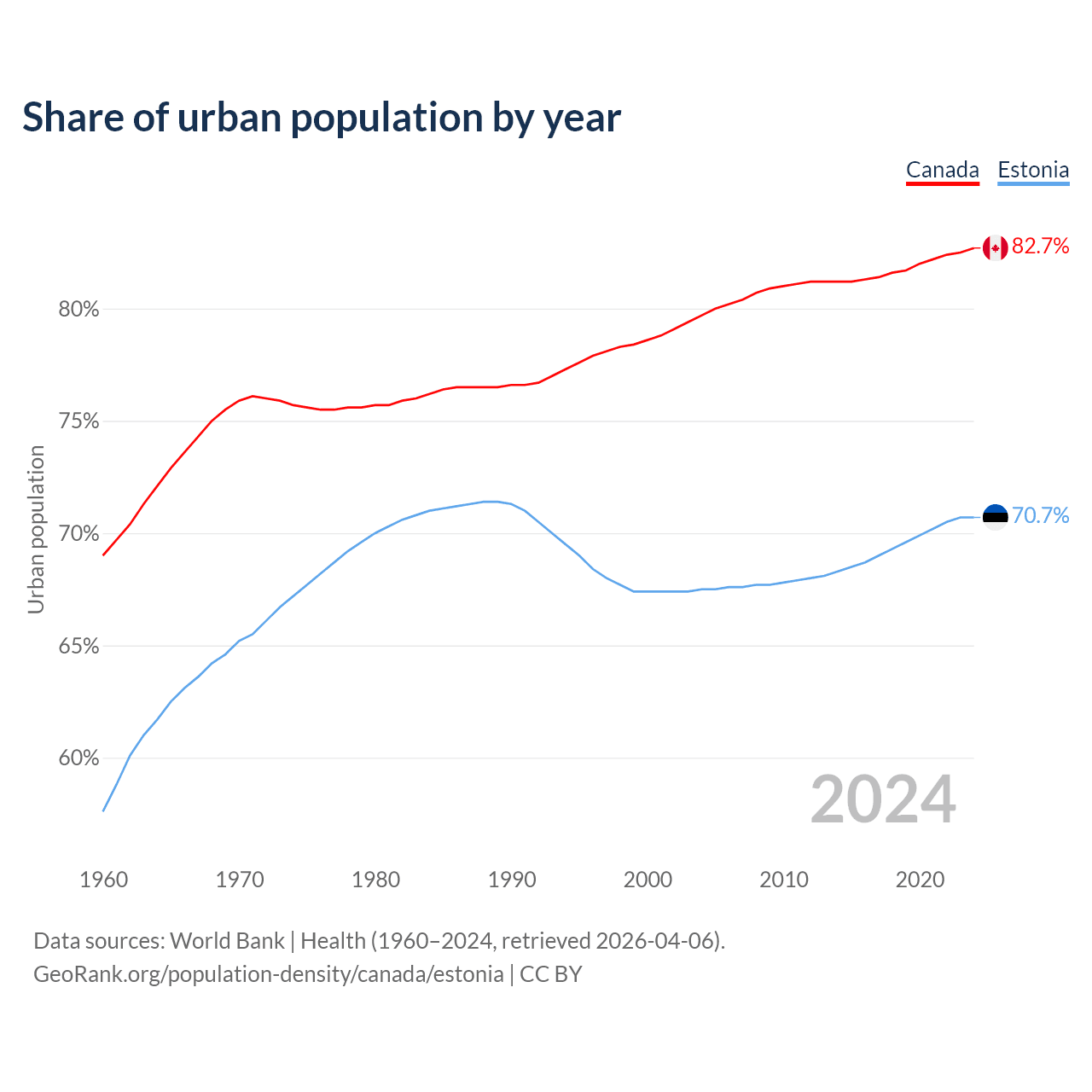From 2004 to 2024, the share of urban population changed from 79.7% to 82.7% in Canada and from 67.5% to 70.7% in Estonia.