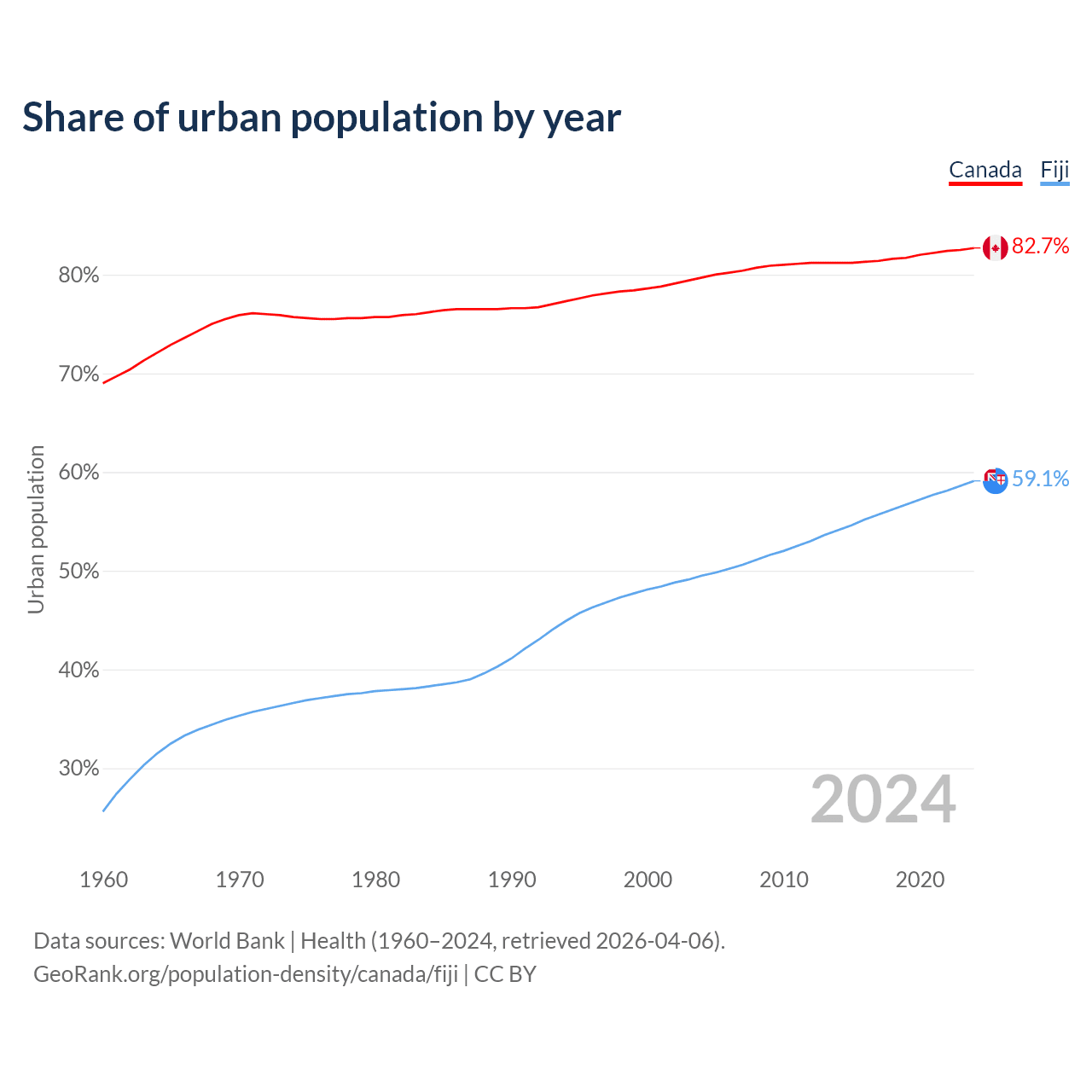 From 2004 to 2024, the share of urban population changed from 79.7% to 82.7% in Canada and from 49.5% to 59.1% in Fiji.