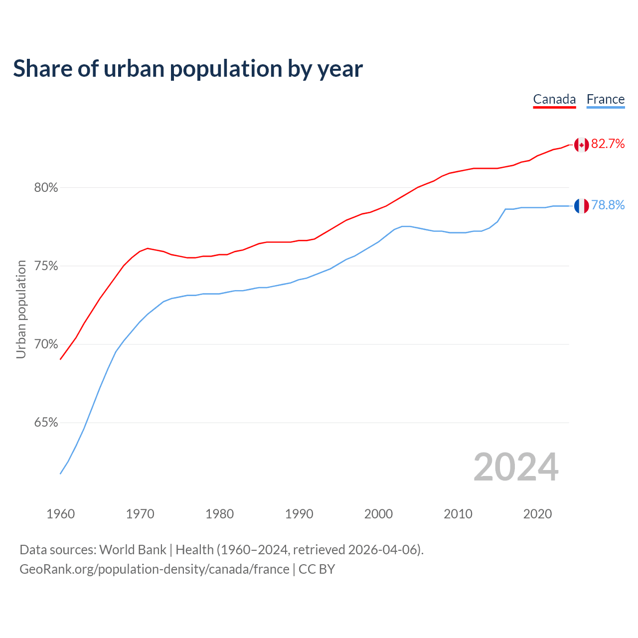 From 2004 to 2024, the share of urban population changed from 79.7% to 82.7% in Canada and from 77.5% to 78.8% in France.