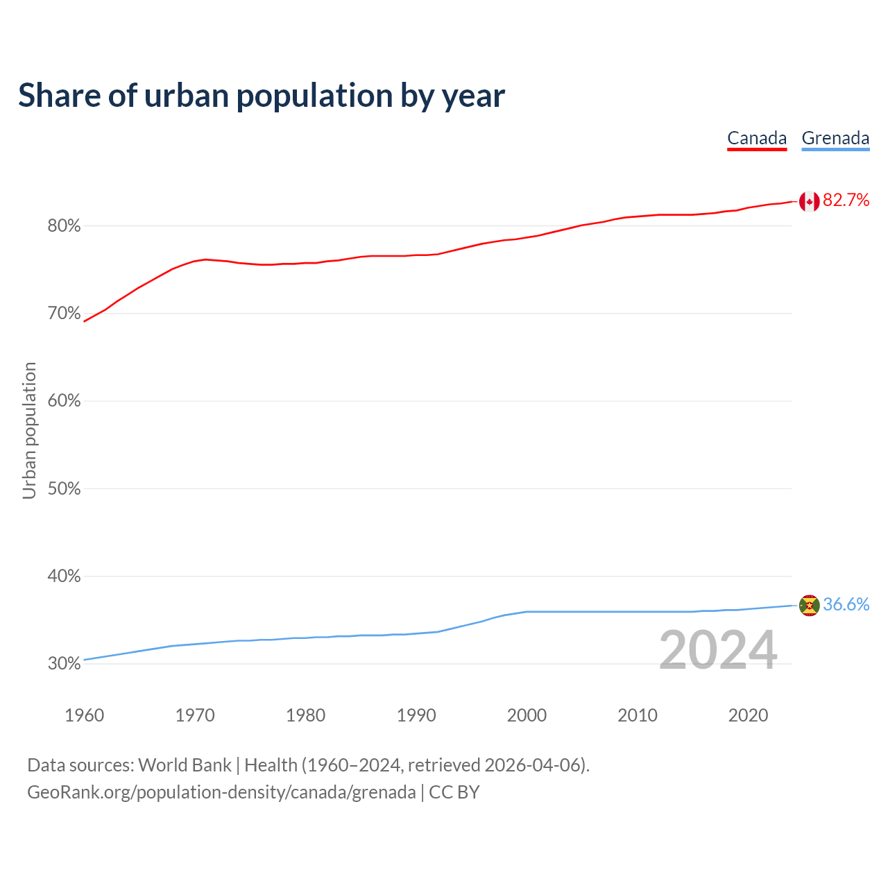 From 2004 to 2024, the share of urban population changed from 79.7% to 82.7% in Canada and from 35.9% to 36.6% in Grenada.