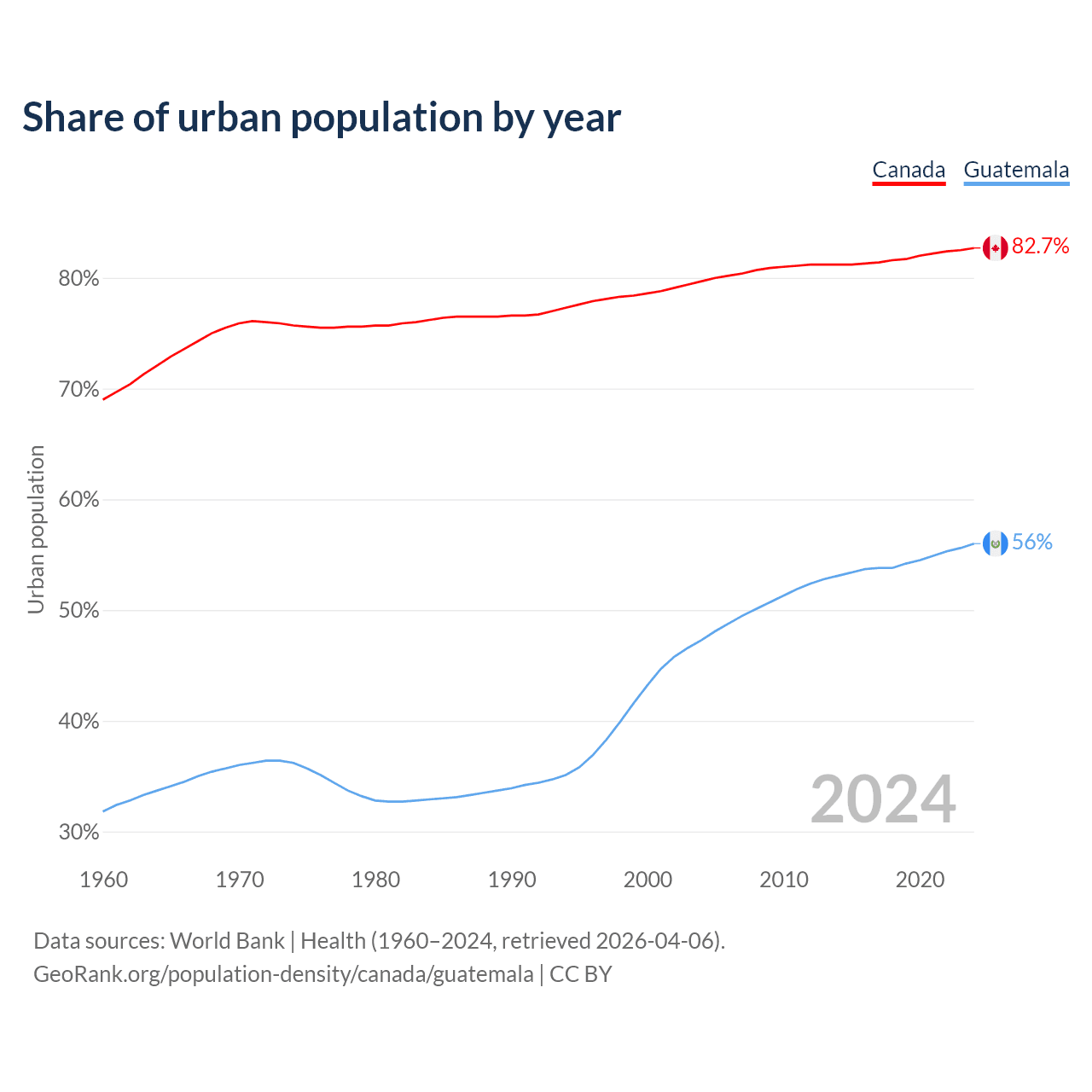 From 2004 to 2024, the share of urban population changed from 79.7% to 82.7% in Canada and from 47.3% to 56% in Guatemala.