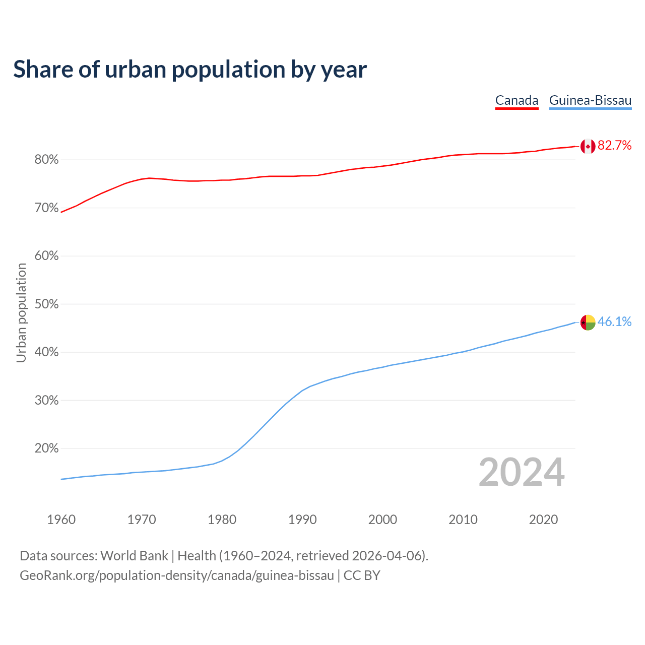 From 2004 to 2024, the share of urban population changed from 79.7% to 82.7% in Canada and from 38.1% to 46.1% in Guinea-Bissau.