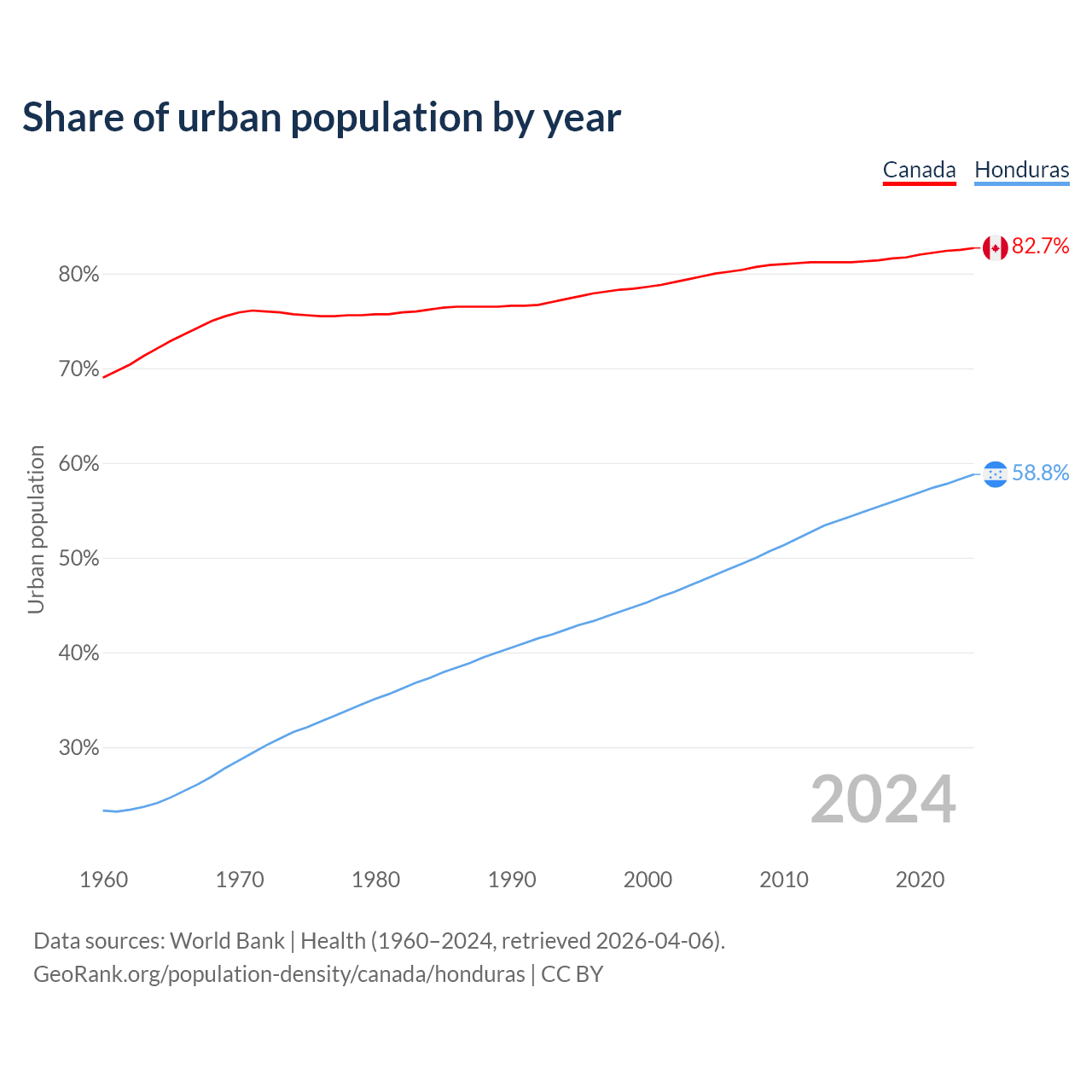 From 2004 to 2024, the share of urban population changed from 79.7% to 82.7% in Canada and from 47.6% to 58.8% in Honduras.