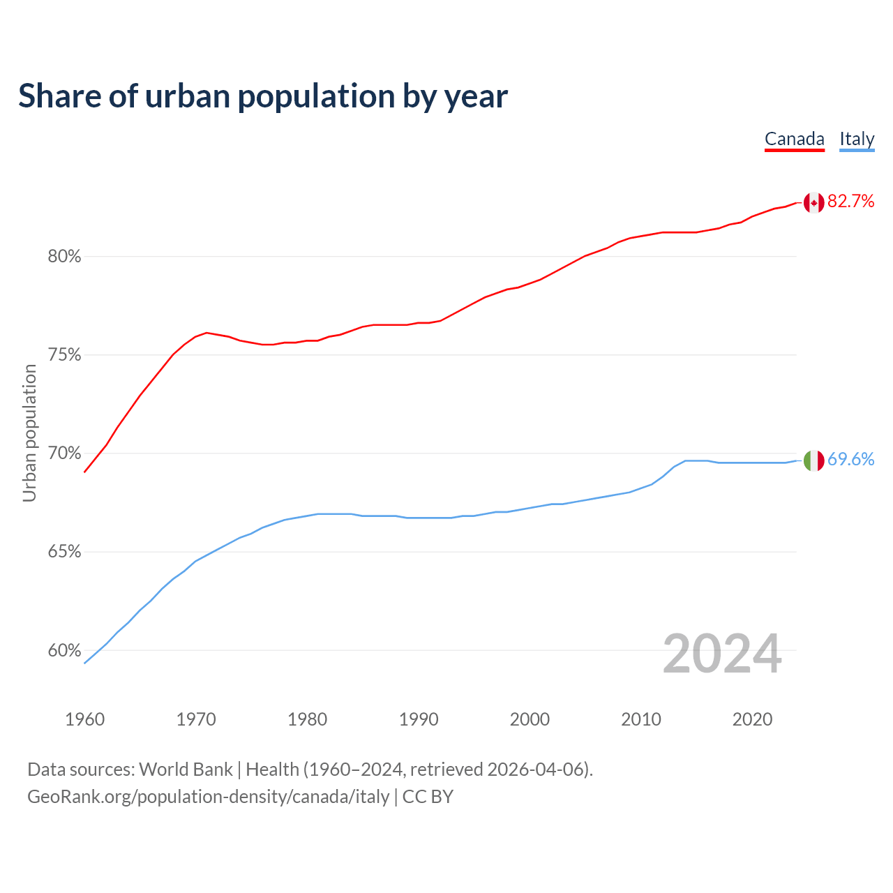 From 2004 to 2024, the share of urban population changed from 79.7% to 82.7% in Canada and from 67.5% to 69.6% in Italy.