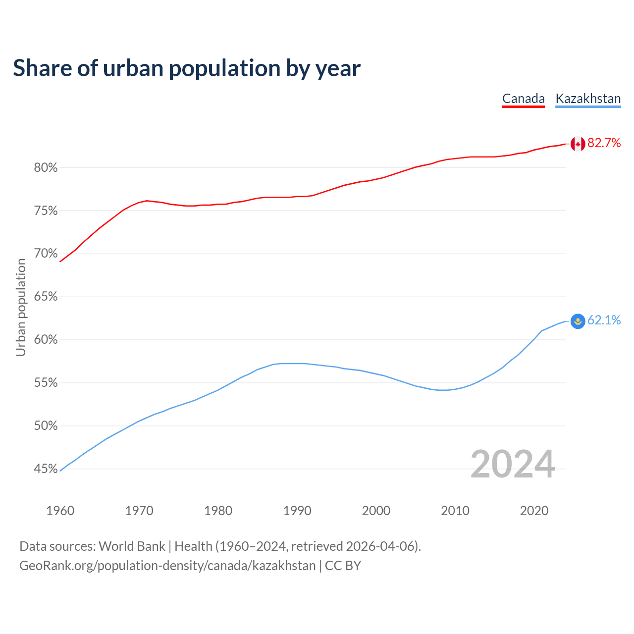 From 2004 to 2024, the share of urban population changed from 79.7% to 82.7% in Canada and from 54.9% to 62.1% in Kazakhstan.