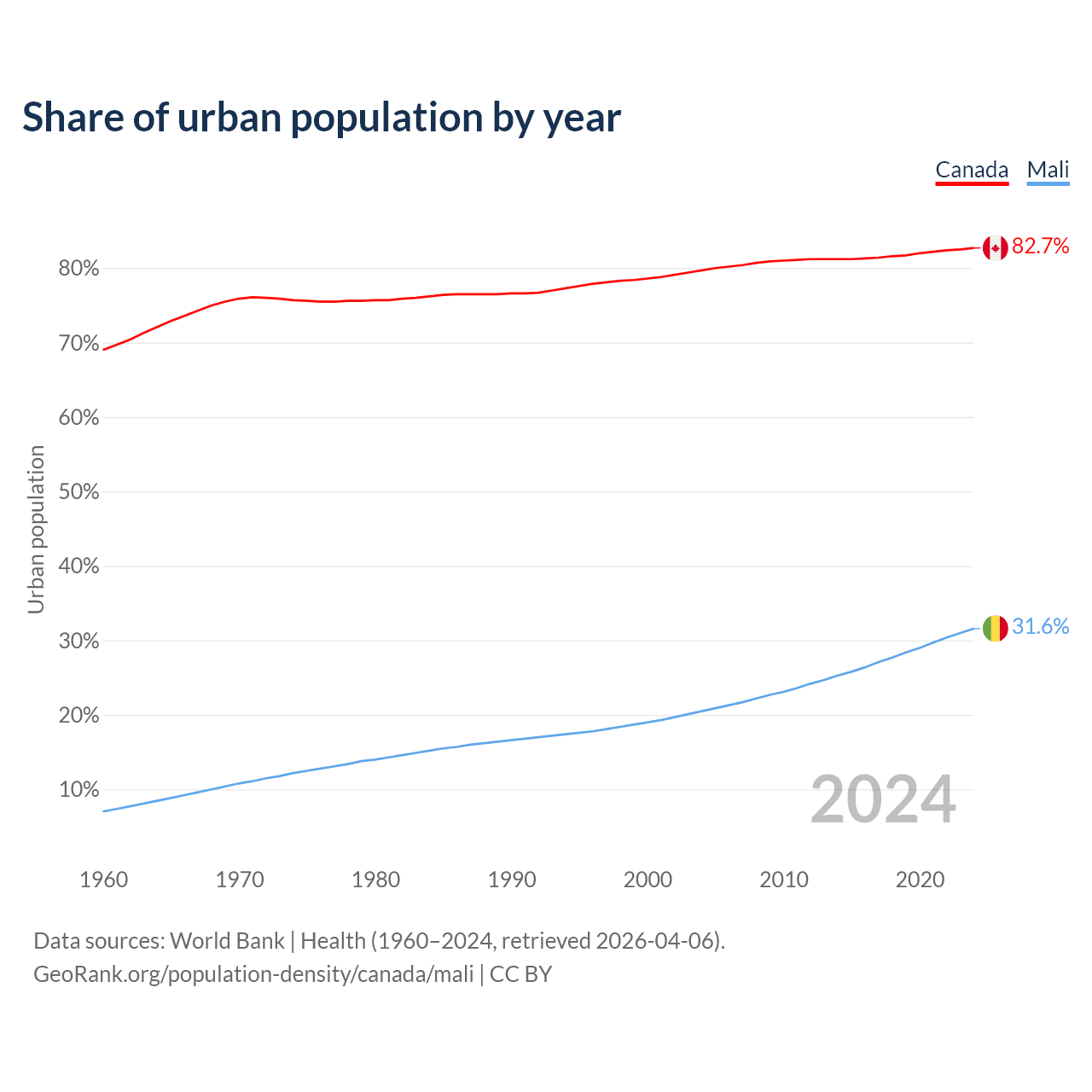 From 2004 to 2024, the share of urban population changed from 79.7% to 82.7% in Canada and from 20.5% to 31.6% in Mali.