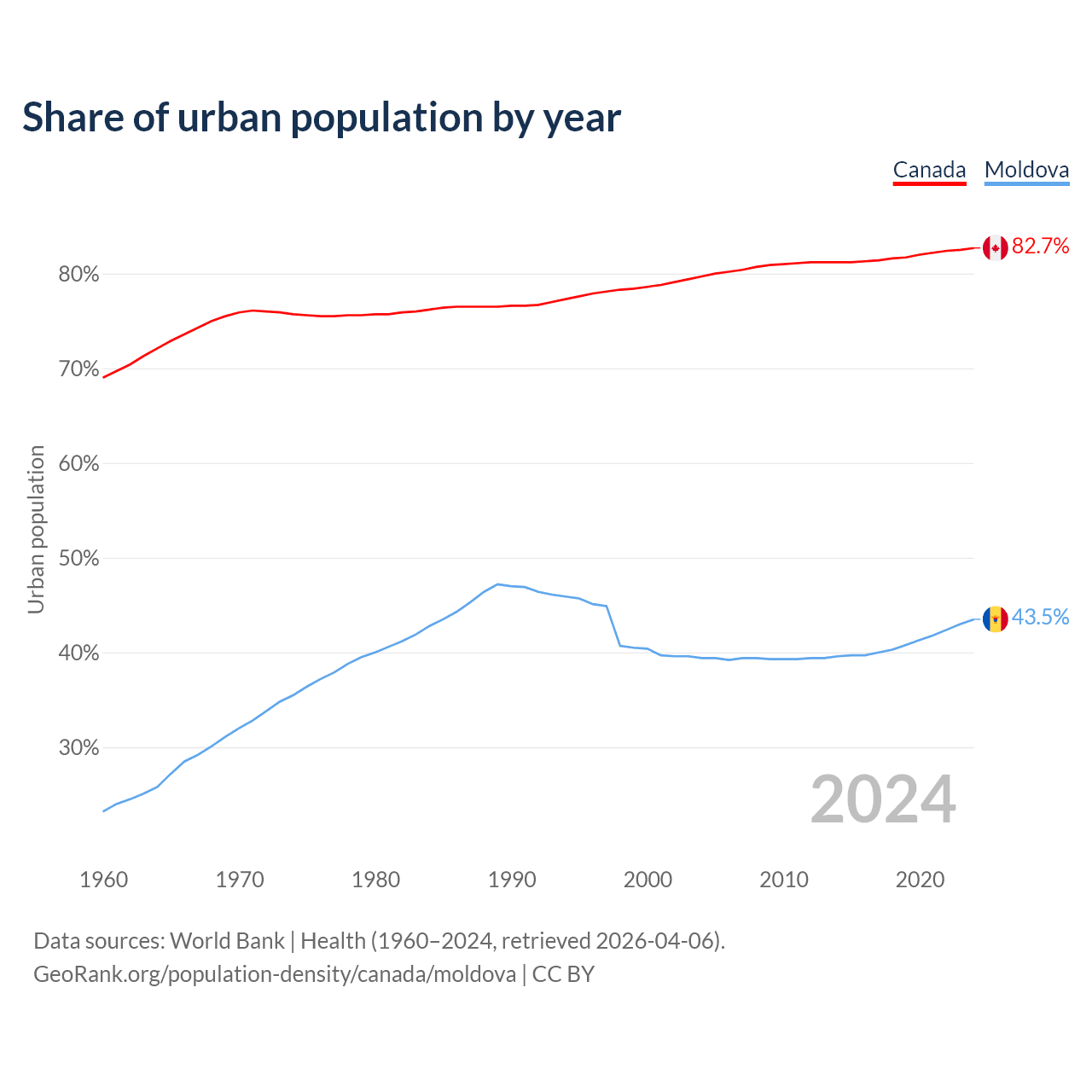 From 2004 to 2024, the share of urban population changed from 79.7% to 82.7% in Canada and from 39.4% to 43.5% in Moldova.