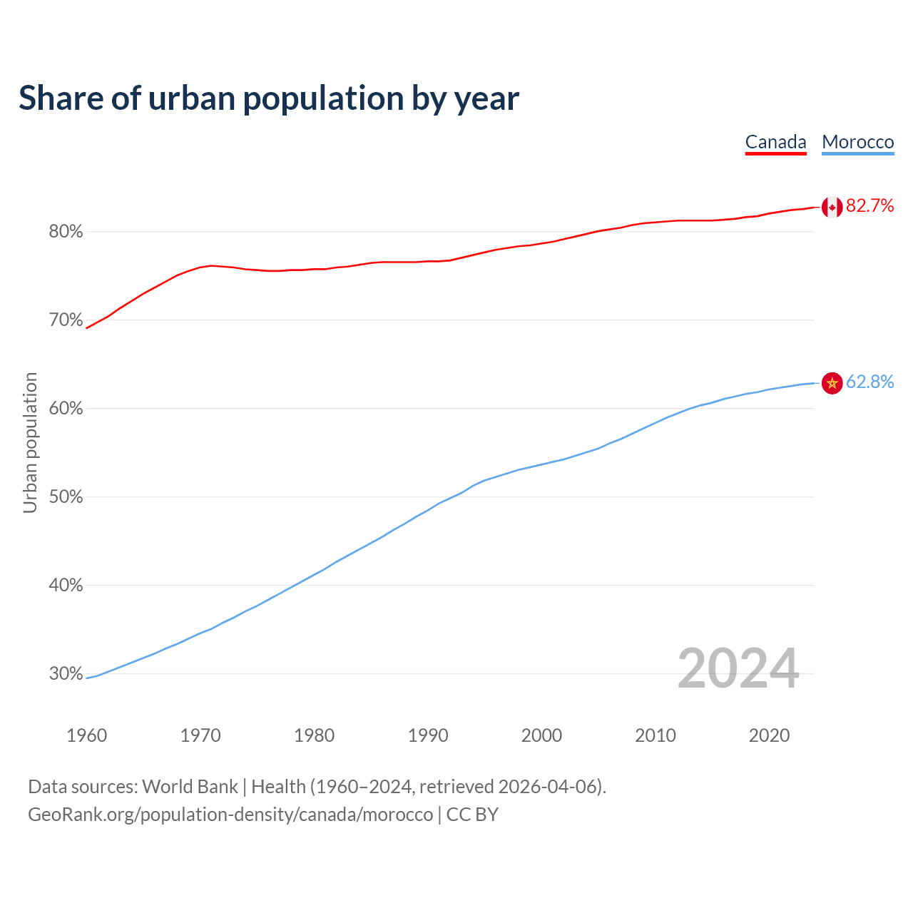 From 2004 to 2024, the share of urban population changed from 79.7% to 82.7% in Canada and from 55% to 62.8% in Morocco.