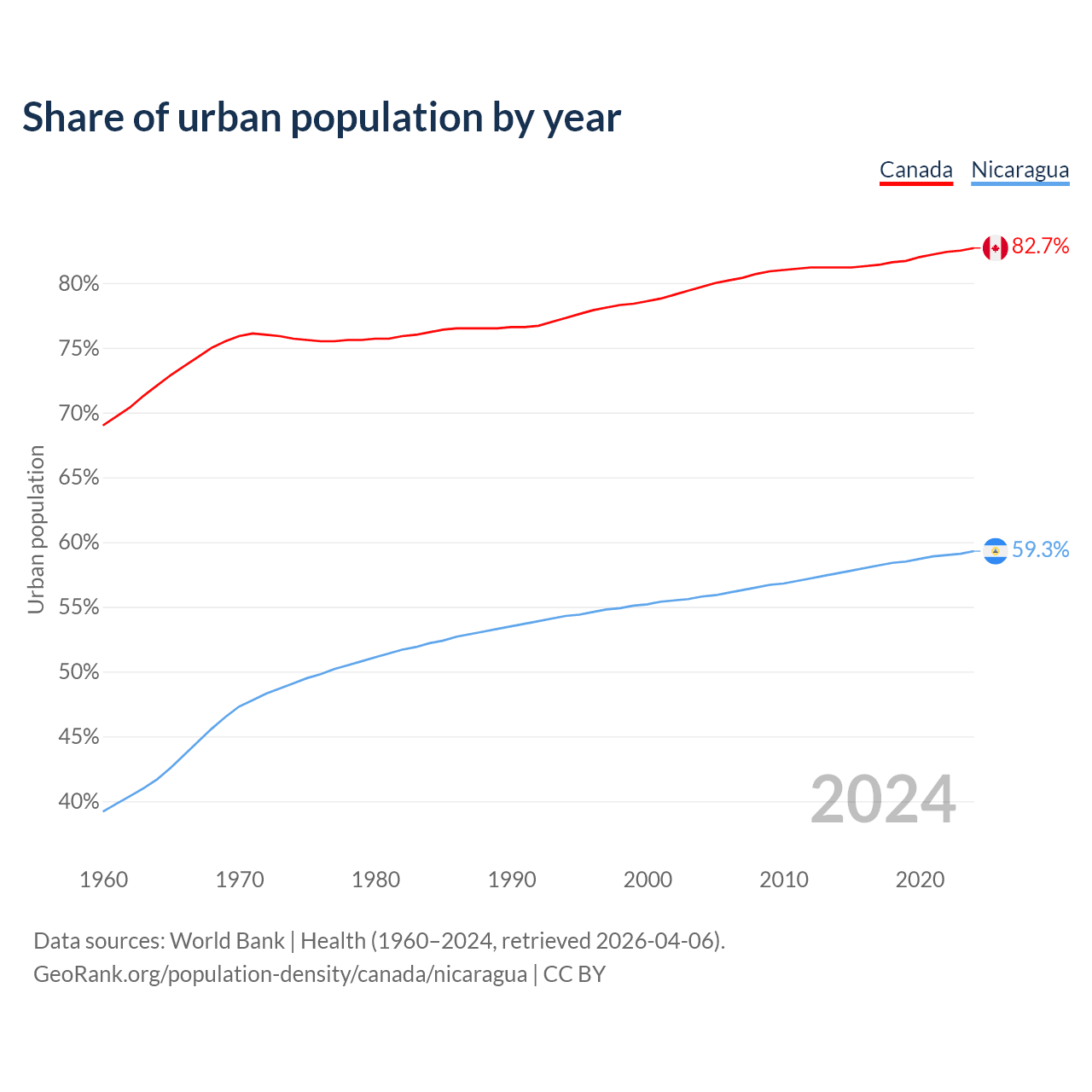 From 2004 to 2024, the share of urban population changed from 79.7% to 82.7% in Canada and from 55.8% to 59.3% in Nicaragua.