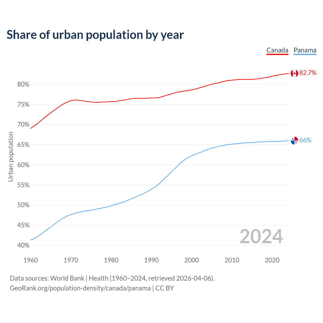 From 2004 to 2024, the share of urban population changed from 79.7% to 82.7% in Canada and from 63.8% to 66% in Panama.