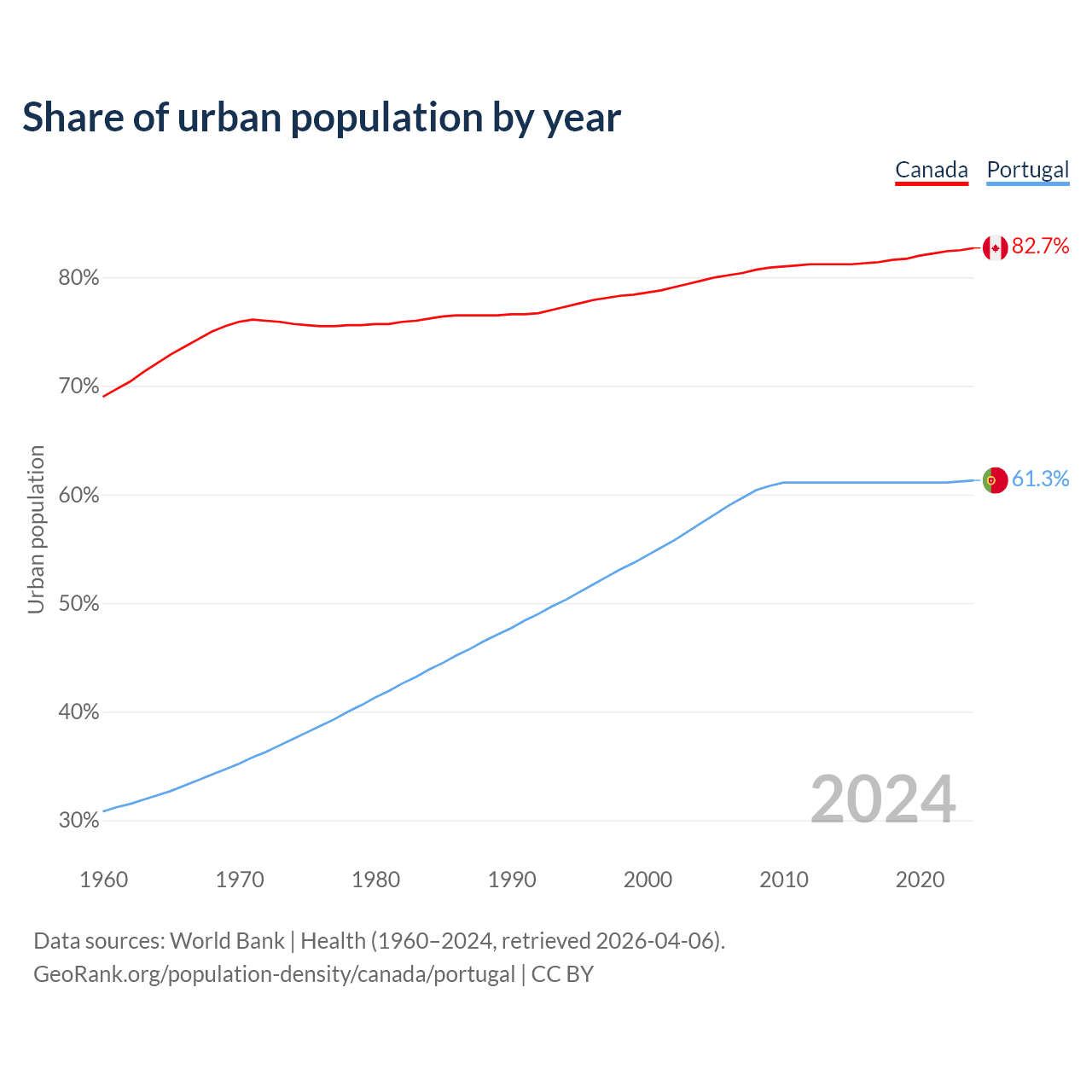 From 2004 to 2024, the share of urban population changed from 79.7% to 82.7% in Canada and from 57.4% to 61.3% in Portugal.