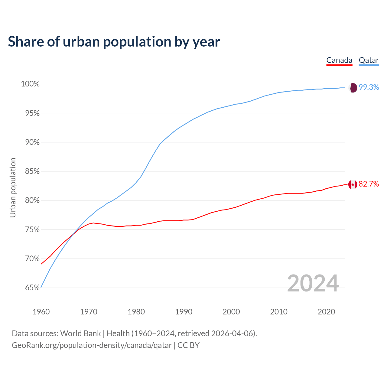 From 2004 to 2024, the share of urban population changed from 79.7% to 82.7% in Canada and from 97% to 99.3% in Qatar.