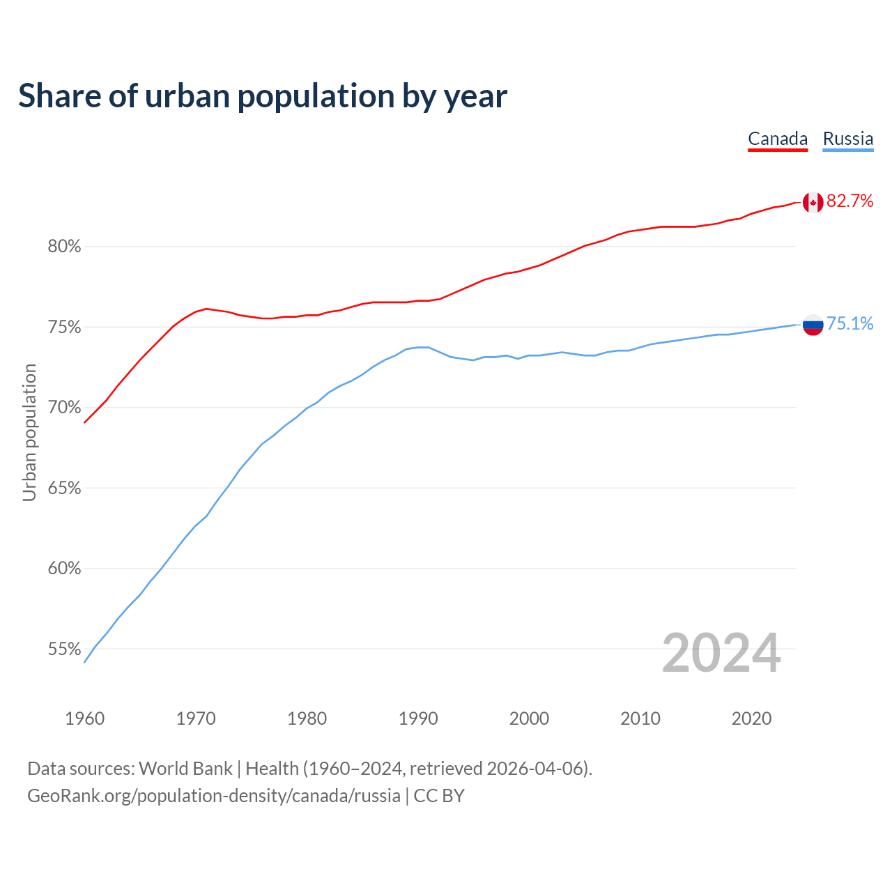 From 2004 to 2024, the share of urban population changed from 79.7% to 82.7% in Canada and from 73.3% to 75.1% in Russia.