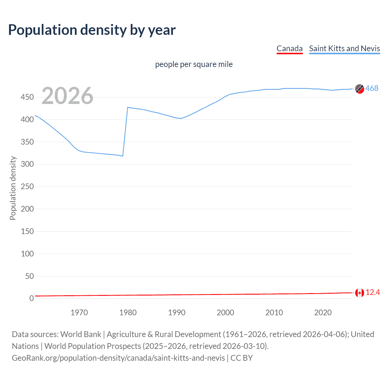 From 2006 to 2026, population density in Canada increased by 31.8%, compared to a 0.93% growth in Saint Kitts and Nevis.