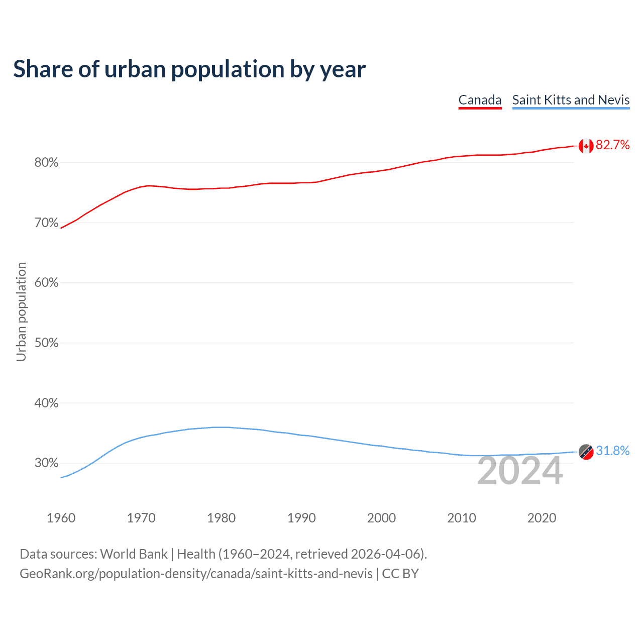 From 2004 to 2024, the share of urban population changed from 79.7% to 82.7% in Canada and from 32.1% to 31.8% in Saint Kitts and Nevis.