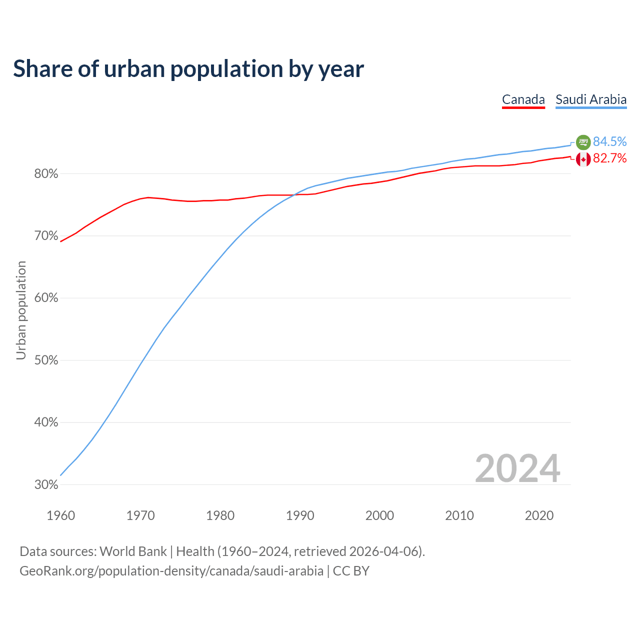From 2004 to 2024, the share of urban population changed from 79.7% to 82.7% in Canada and from 80.8% to 84.5% in Saudi Arabia.