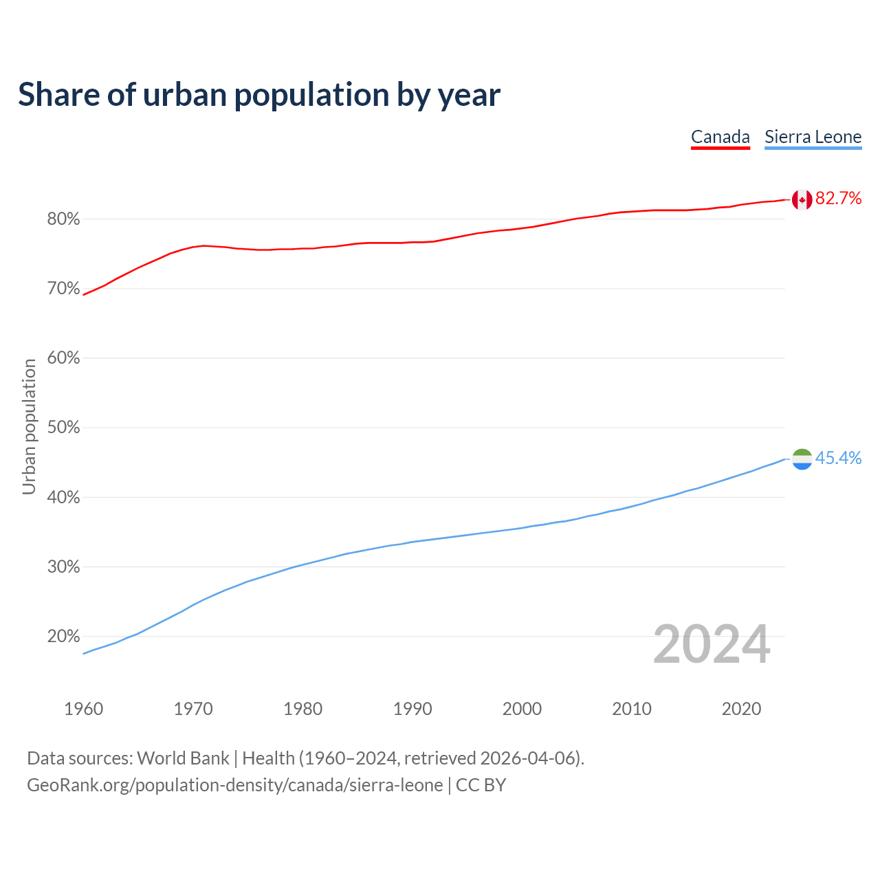 From 2004 to 2024, the share of urban population changed from 79.7% to 82.7% in Canada and from 36.5% to 45.4% in Sierra Leone.