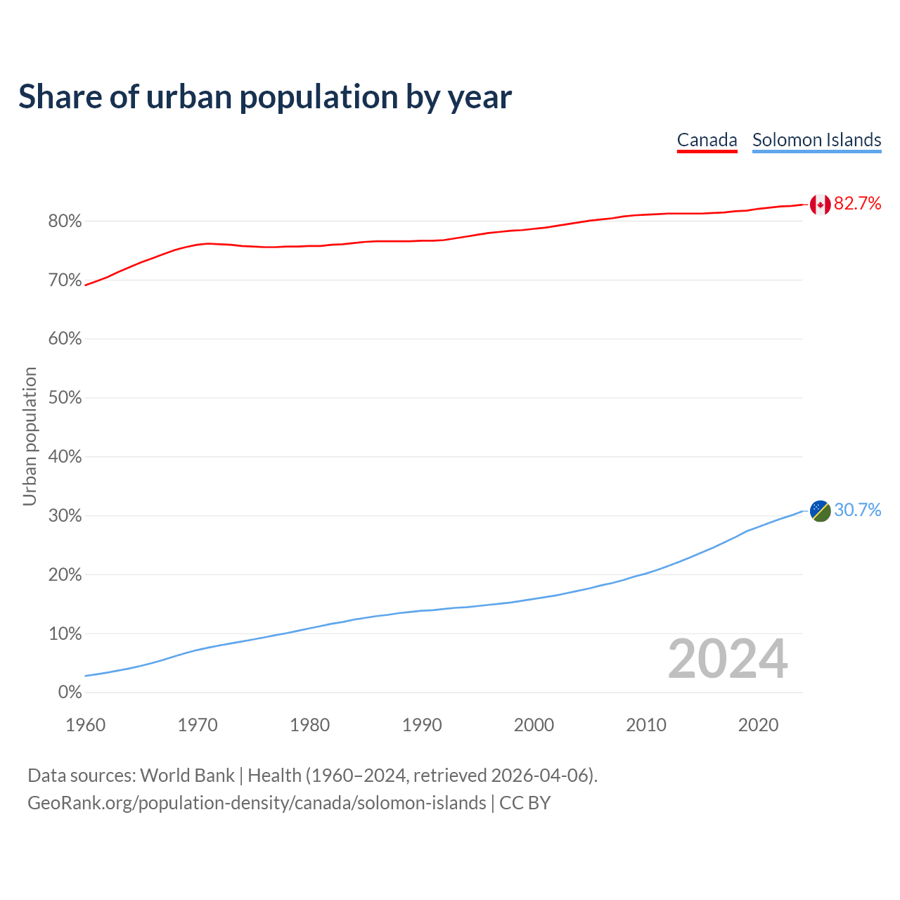 From 2004 to 2024, the share of urban population changed from 79.7% to 82.7% in Canada and from 17.2% to 30.7% in the Solomon Islands.