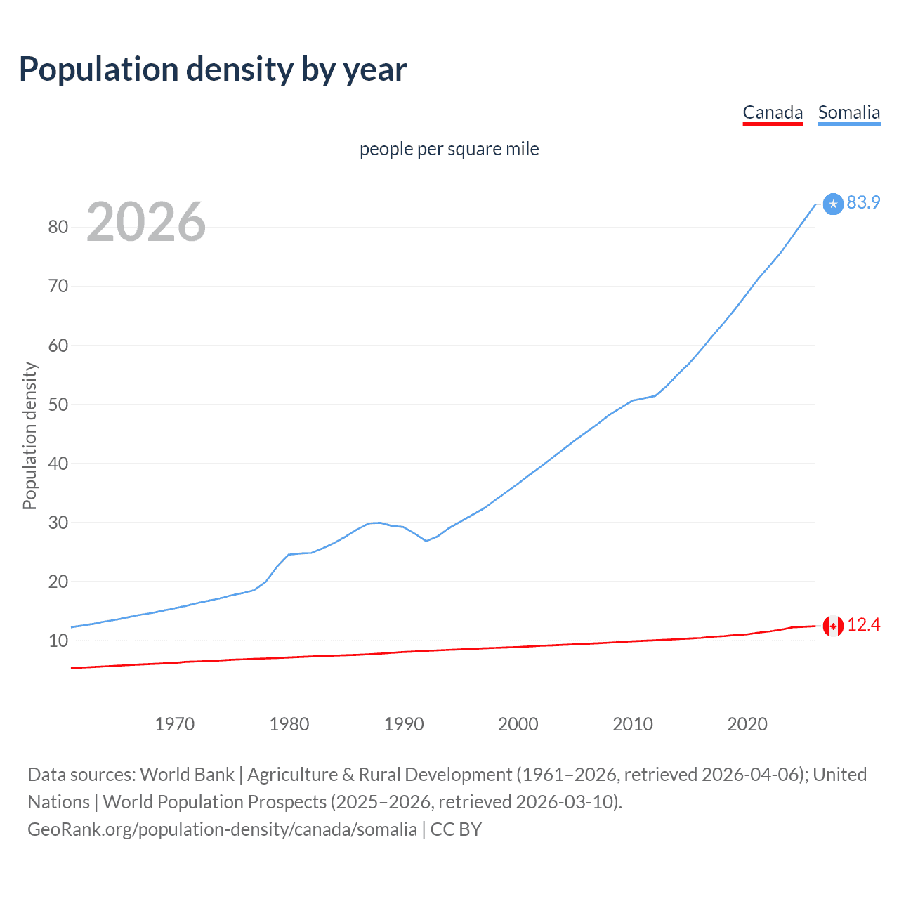 From 2006 to 2026, population density in Canada increased by 31.8%, compared to a 85.2% growth in Somalia.