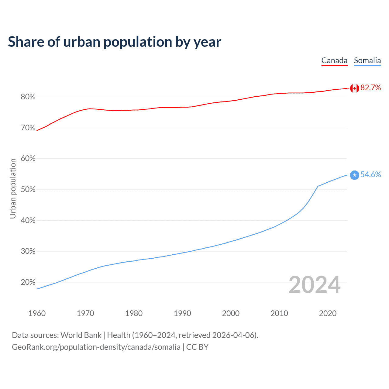 From 2004 to 2024, the share of urban population changed from 79.7% to 82.7% in Canada and from 35% to 54.6% in Somalia.