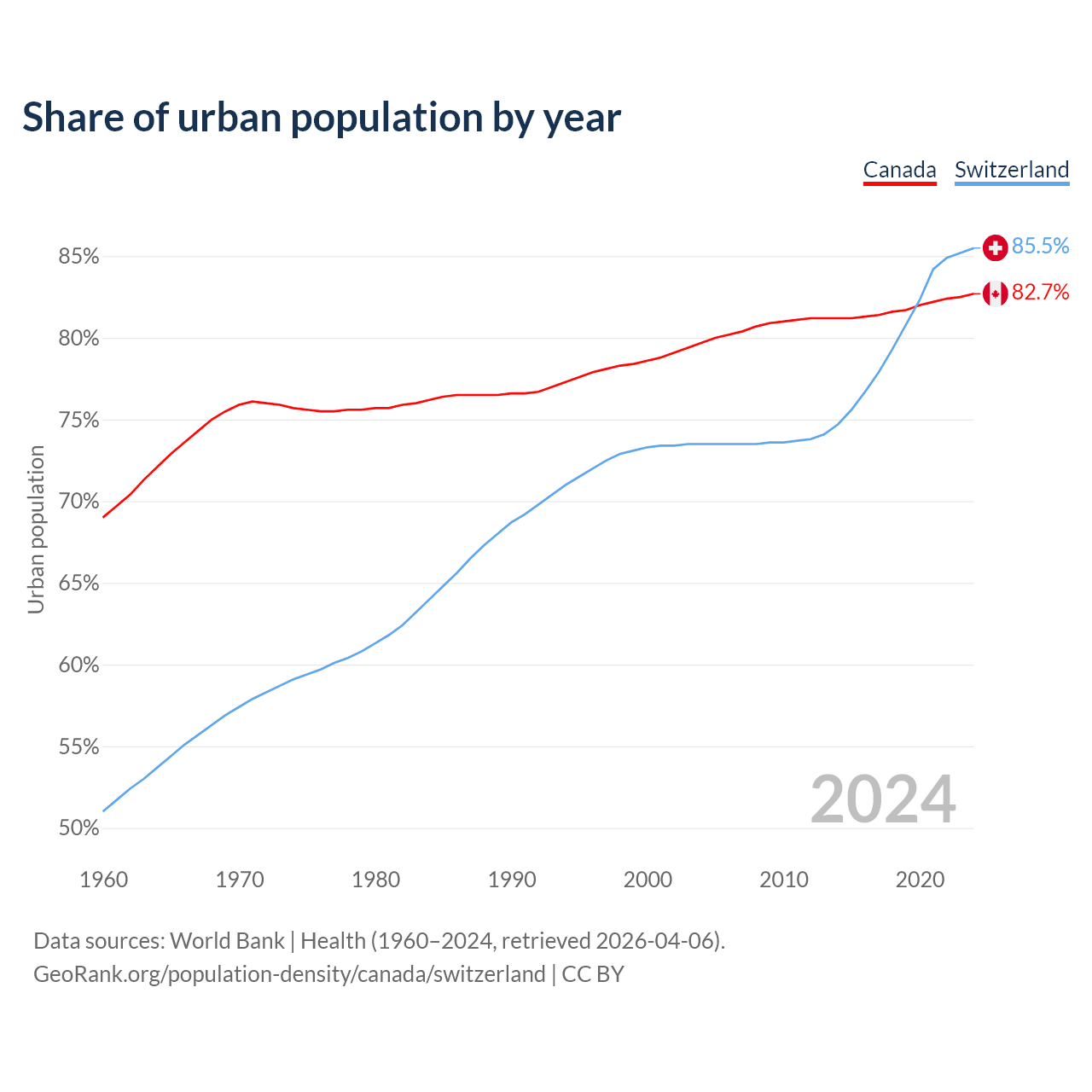From 2004 to 2024, the share of urban population changed from 79.7% to 82.7% in Canada and from 73.5% to 85.5% in Switzerland.