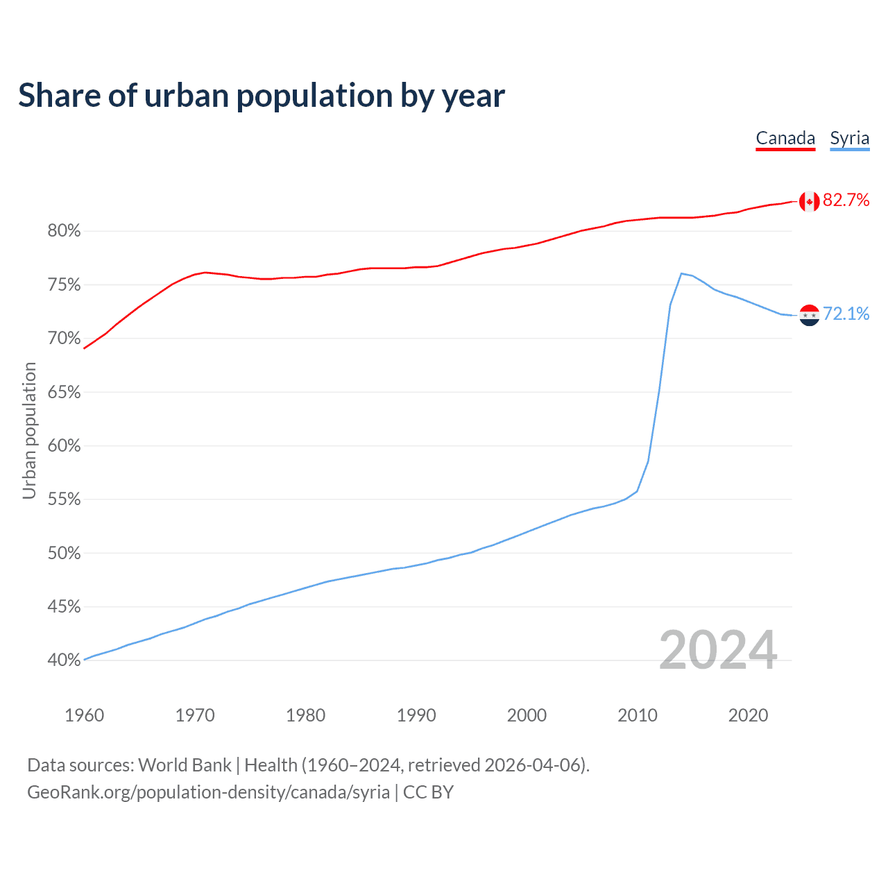 From 2004 to 2024, the share of urban population changed from 79.7% to 82.7% in Canada and from 53.5% to 72.1% in Syria.