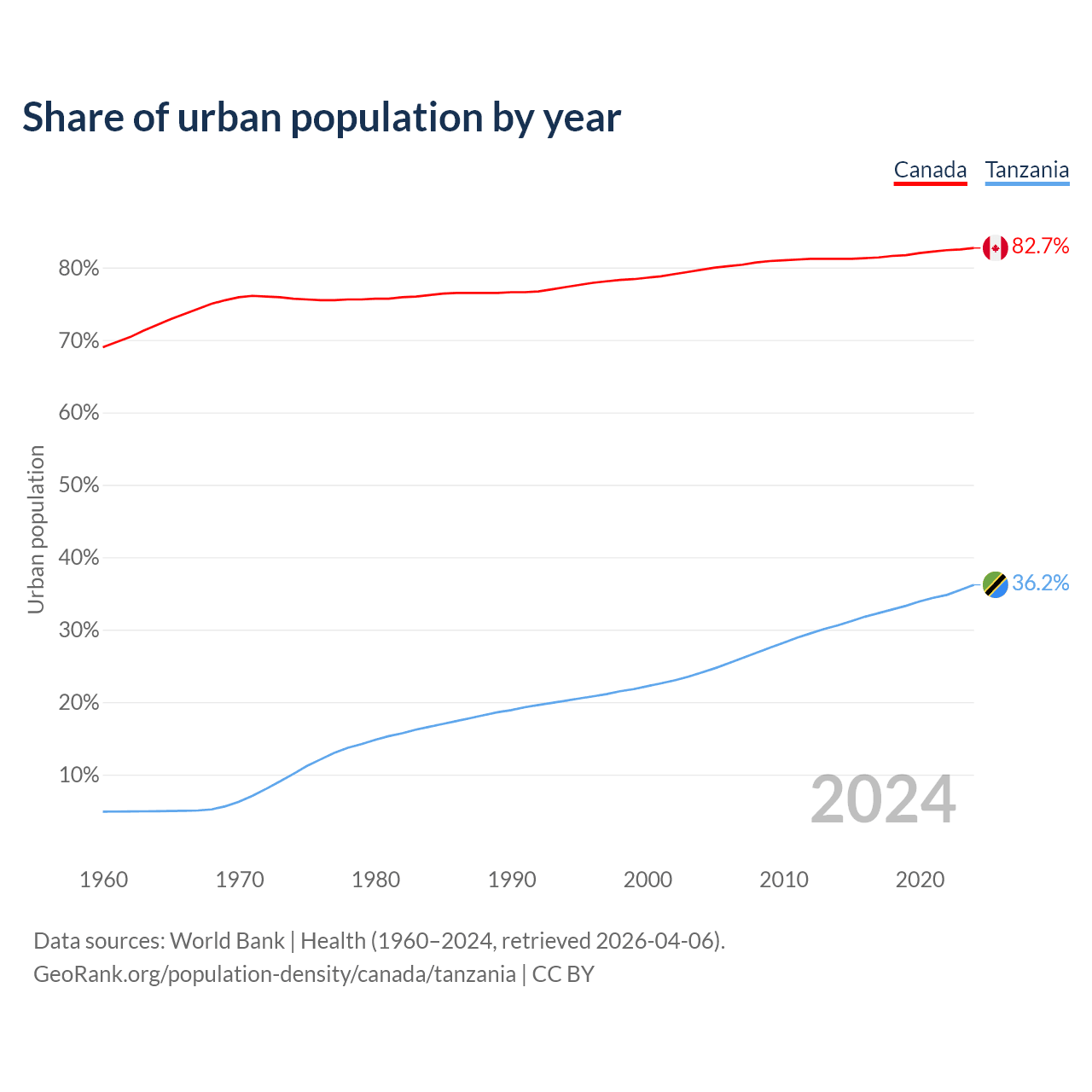 From 2004 to 2024, the share of urban population changed from 79.7% to 82.7% in Canada and from 24.1% to 36.2% in Tanzania.