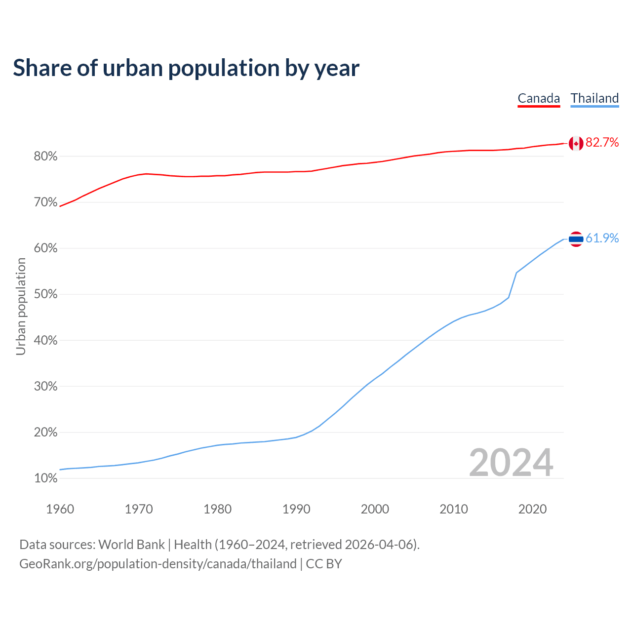 From 2004 to 2024, the share of urban population changed from 79.7% to 82.7% in Canada and from 36.8% to 61.9% in Thailand.