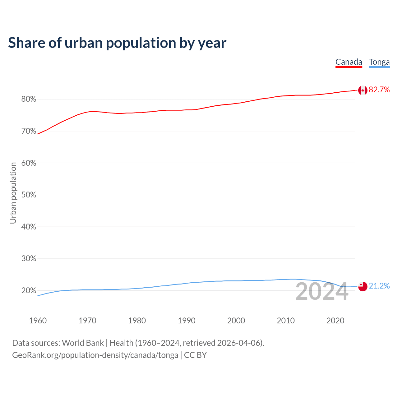 From 2004 to 2024, the share of urban population changed from 79.7% to 82.7% in Canada and from 23.1% to 21.2% in Tonga.