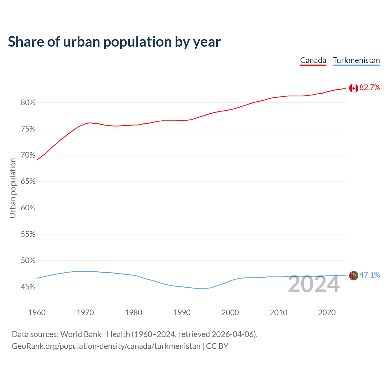 From 2004 to 2024, the share of urban population changed from 79.7% to 82.7% in Canada and from 46.7% to 47.1% in Turkmenistan.