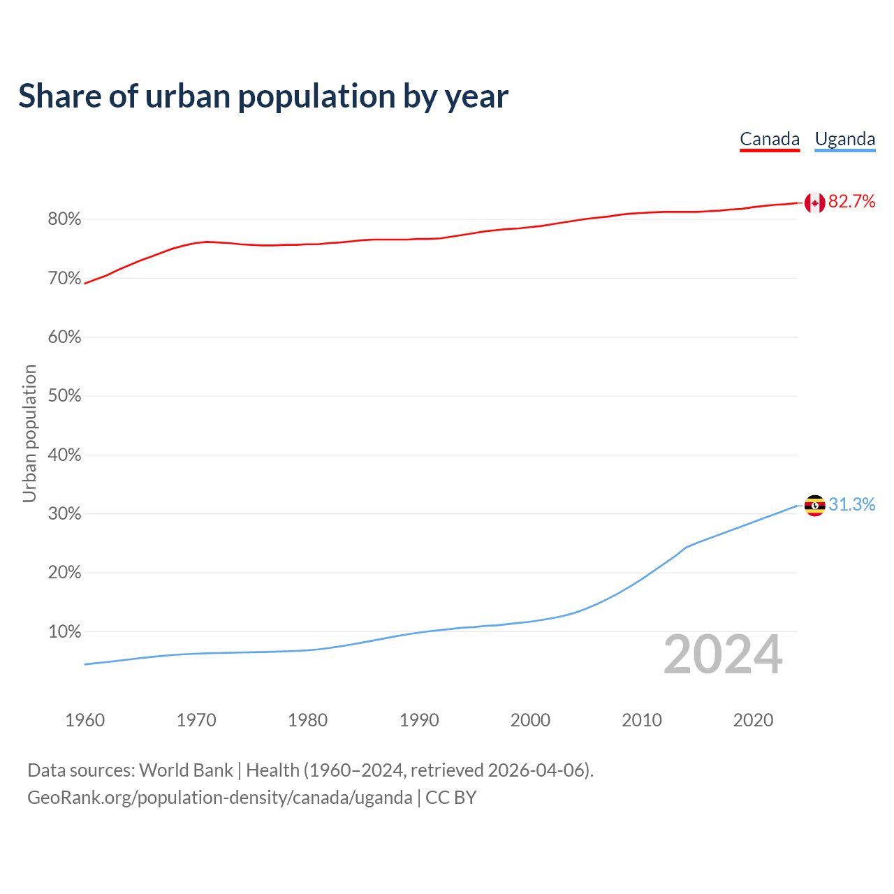 From 2004 to 2024, the share of urban population changed from 79.7% to 82.7% in Canada and from 13.1% to 31.3% in Uganda.