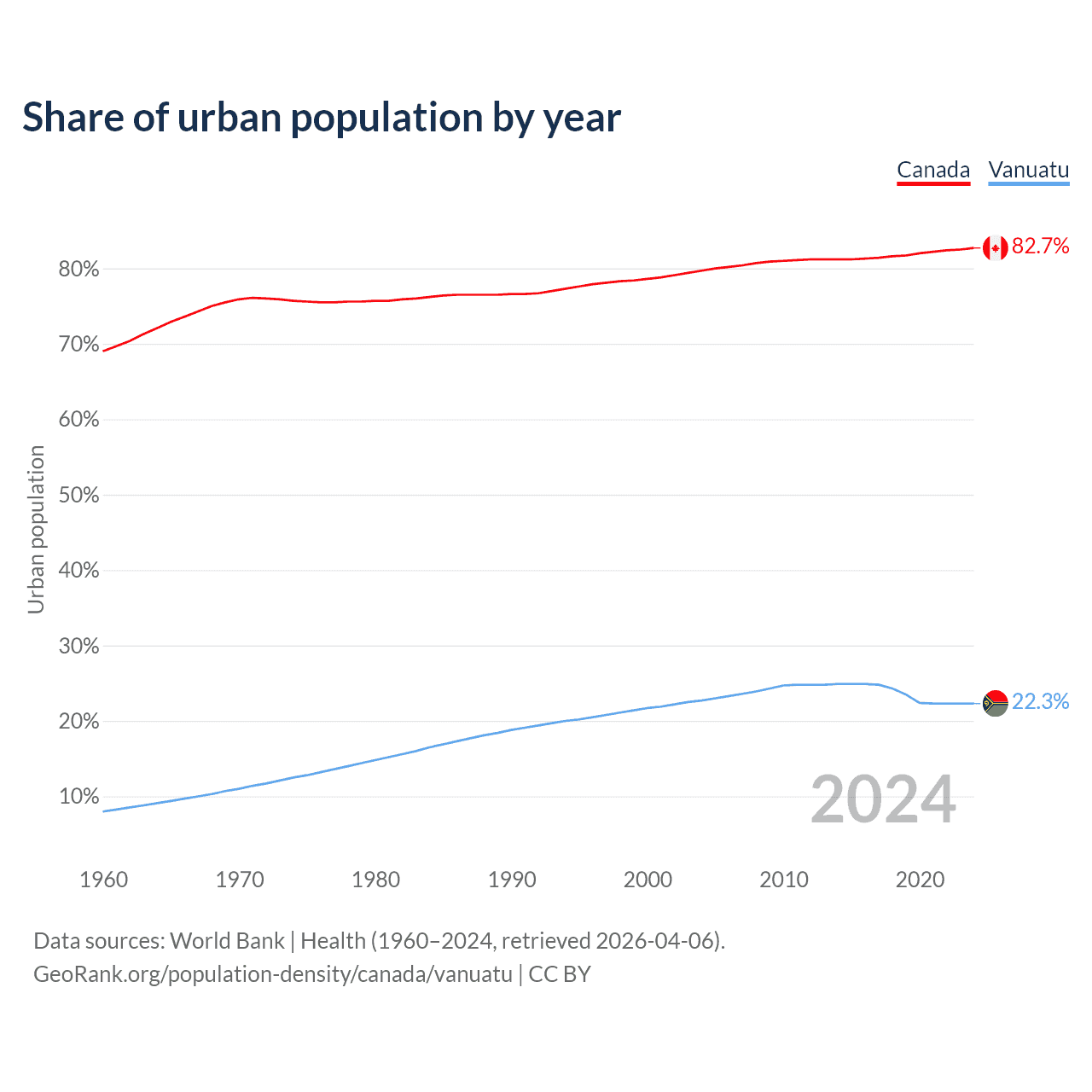 From 2004 to 2024, the share of urban population changed from 79.7% to 82.7% in Canada and from 22.7% to 22.3% in Vanuatu.