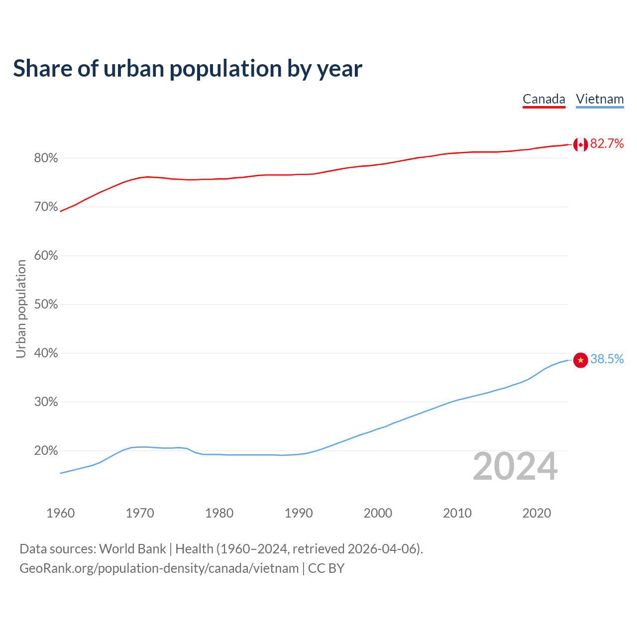 From 2004 to 2024, the share of urban population changed from 79.7% to 82.7% in Canada and from 26.8% to 38.5% in Vietnam.