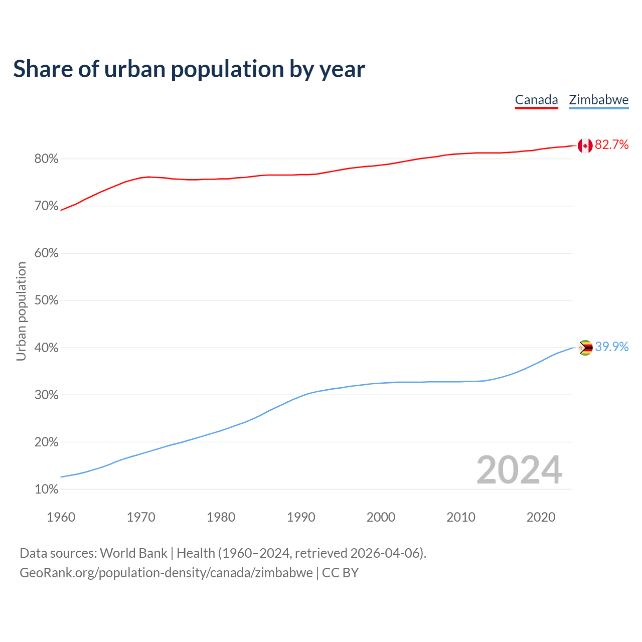 From 2004 to 2024, the share of urban population changed from 79.7% to 82.7% in Canada and from 32.6% to 39.9% in Zimbabwe.