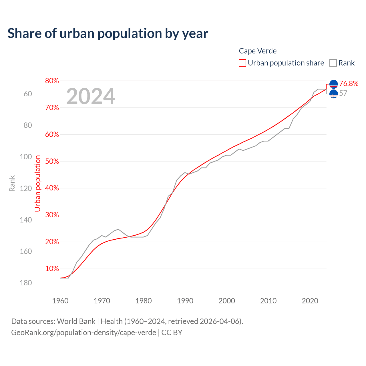 This chart shows the share of urban population in Cape Verde from 1960 to 2024: 6.5% lived in urban areas in 1960, 53.9% in 2000, and 76.8% in 2024.