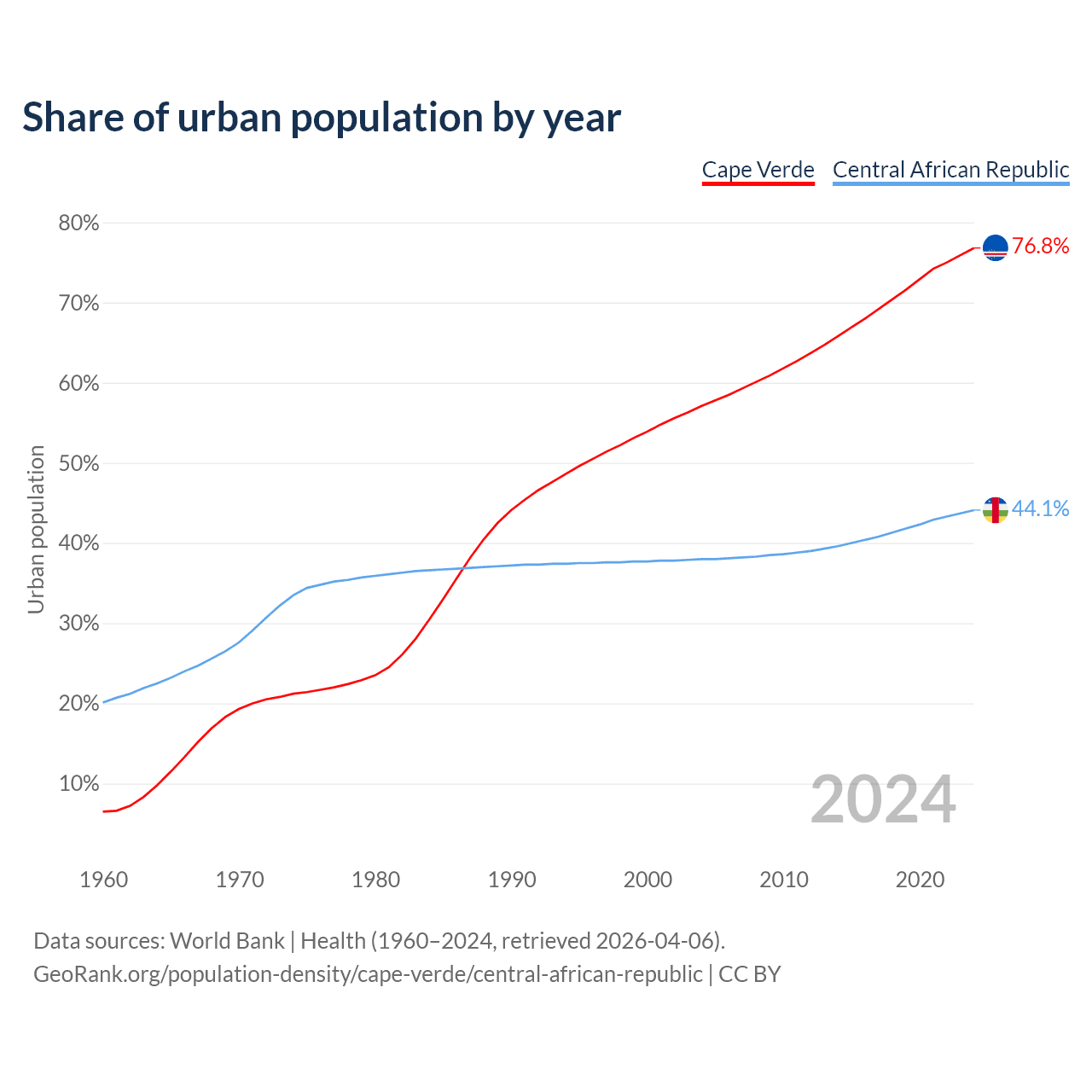 From 2004 to 2024, the share of urban population changed from 57.1% to 76.8% in Cape Verde and from 38% to 44.1% in the Central African Republic.