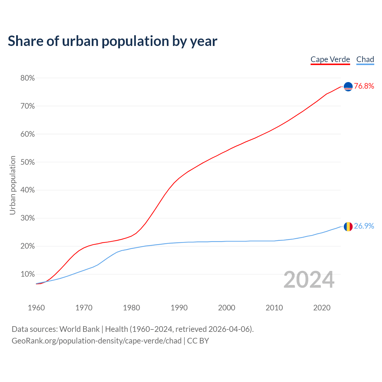 From 2004 to 2024, the share of urban population changed from 57.1% to 76.8% in Cape Verde and from 21.7% to 26.9% in Chad.
