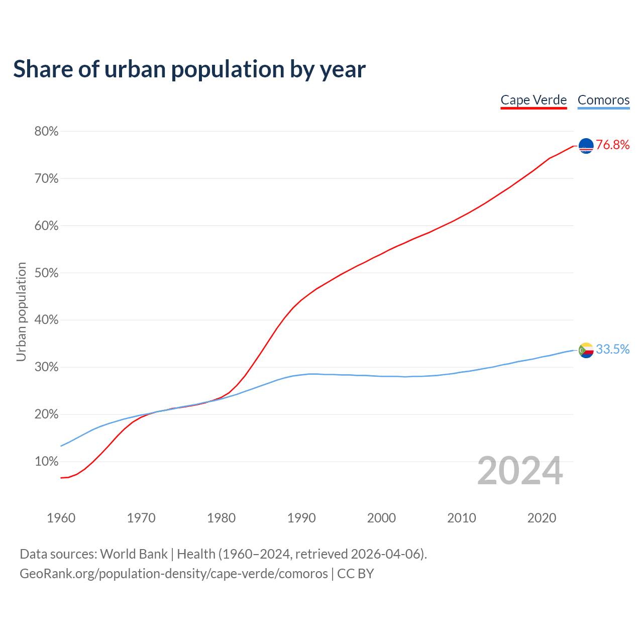 From 2004 to 2024, the share of urban population changed from 57.1% to 76.8% in Cape Verde and from 28% to 33.5% in Comoros.