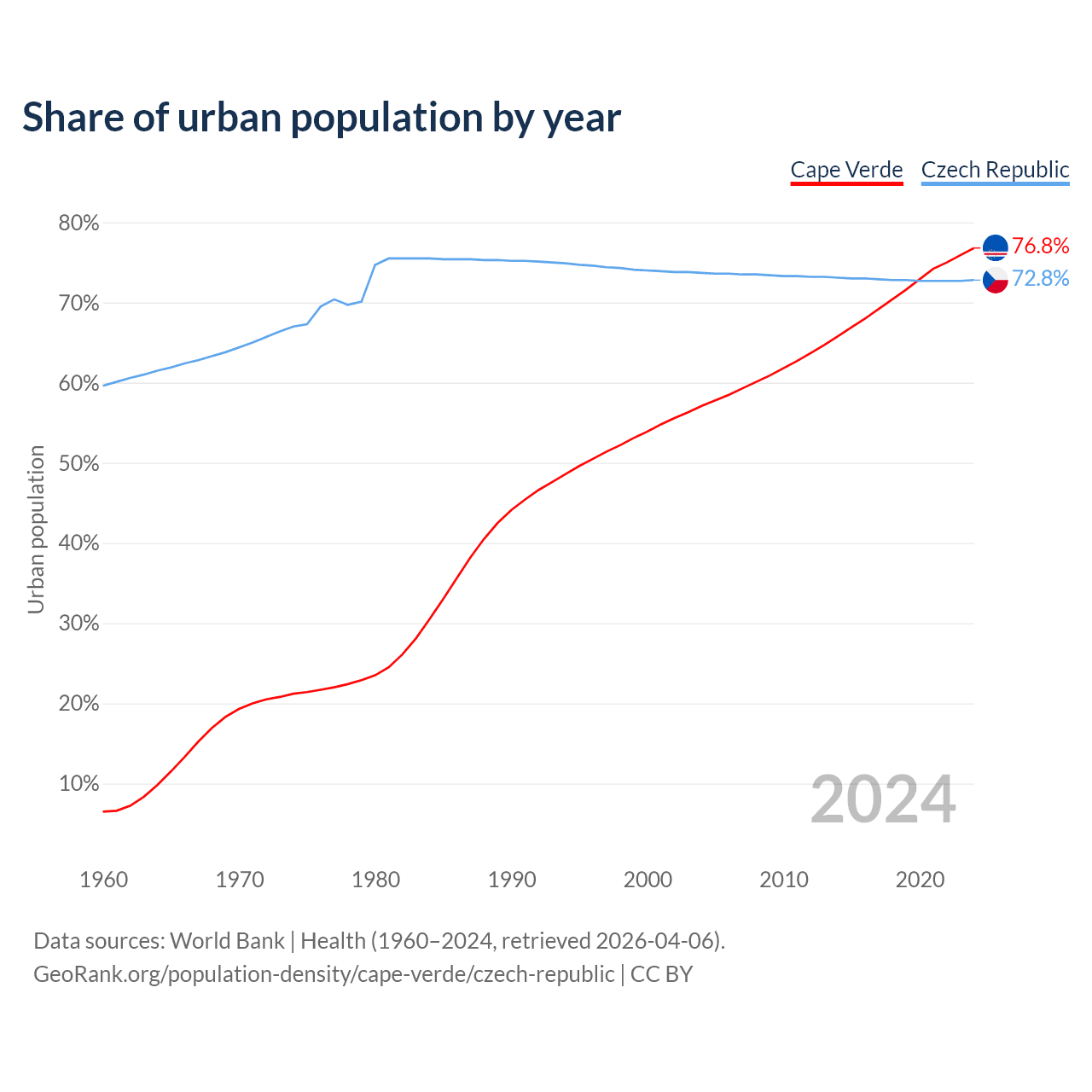 From 2004 to 2024, the share of urban population changed from 57.1% to 76.8% in Cape Verde and from 73.7% to 72.8% in the Czech Republic.