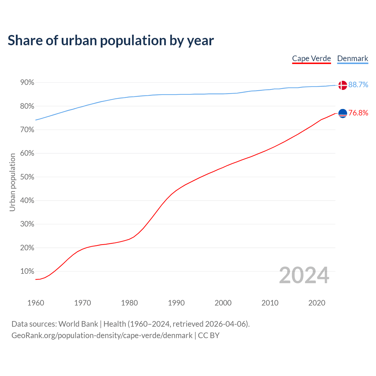From 2004 to 2024, the share of urban population changed from 57.1% to 76.8% in Cape Verde and from 85.7% to 88.7% in Denmark.